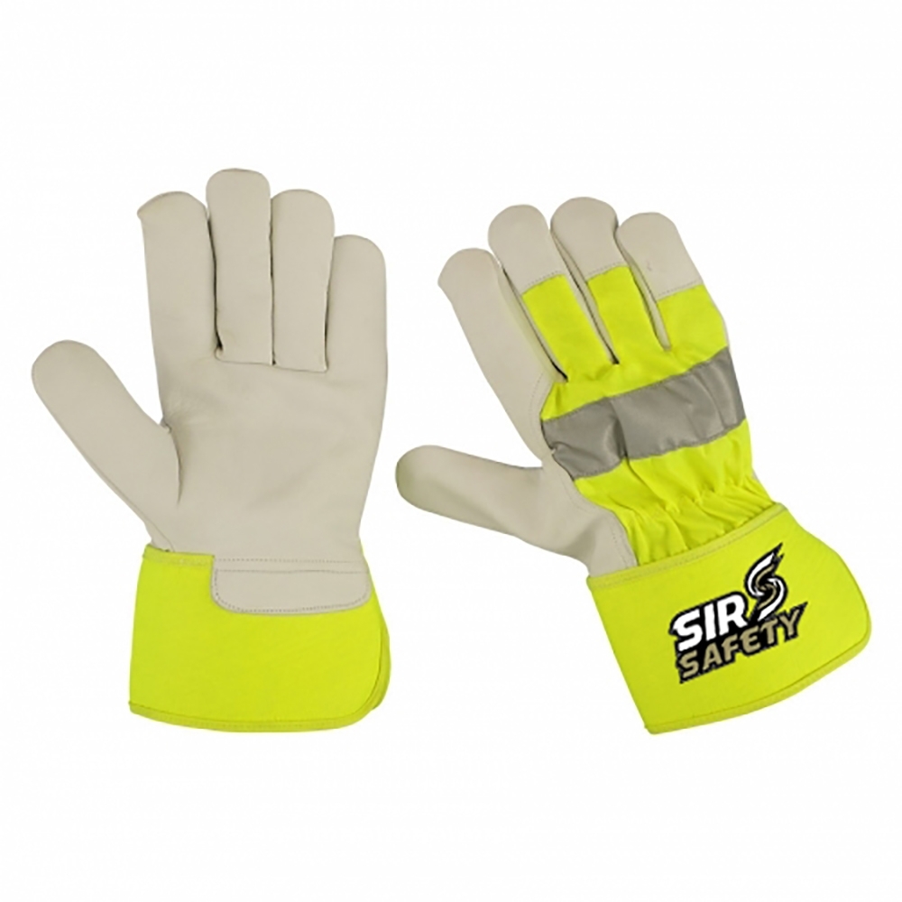 Palm Crust cowhide leather gloves three finger tips hivisible cotton fabric back and shirred elastic on back wing thumb index finger rubberized safety cuff yellow piping.