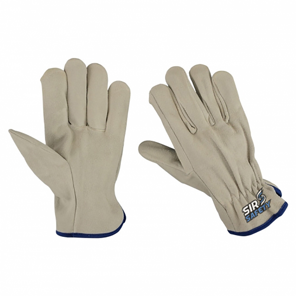 Full split leather gloves stright thumb & straight finger shirred elastic back and royal blue piping.